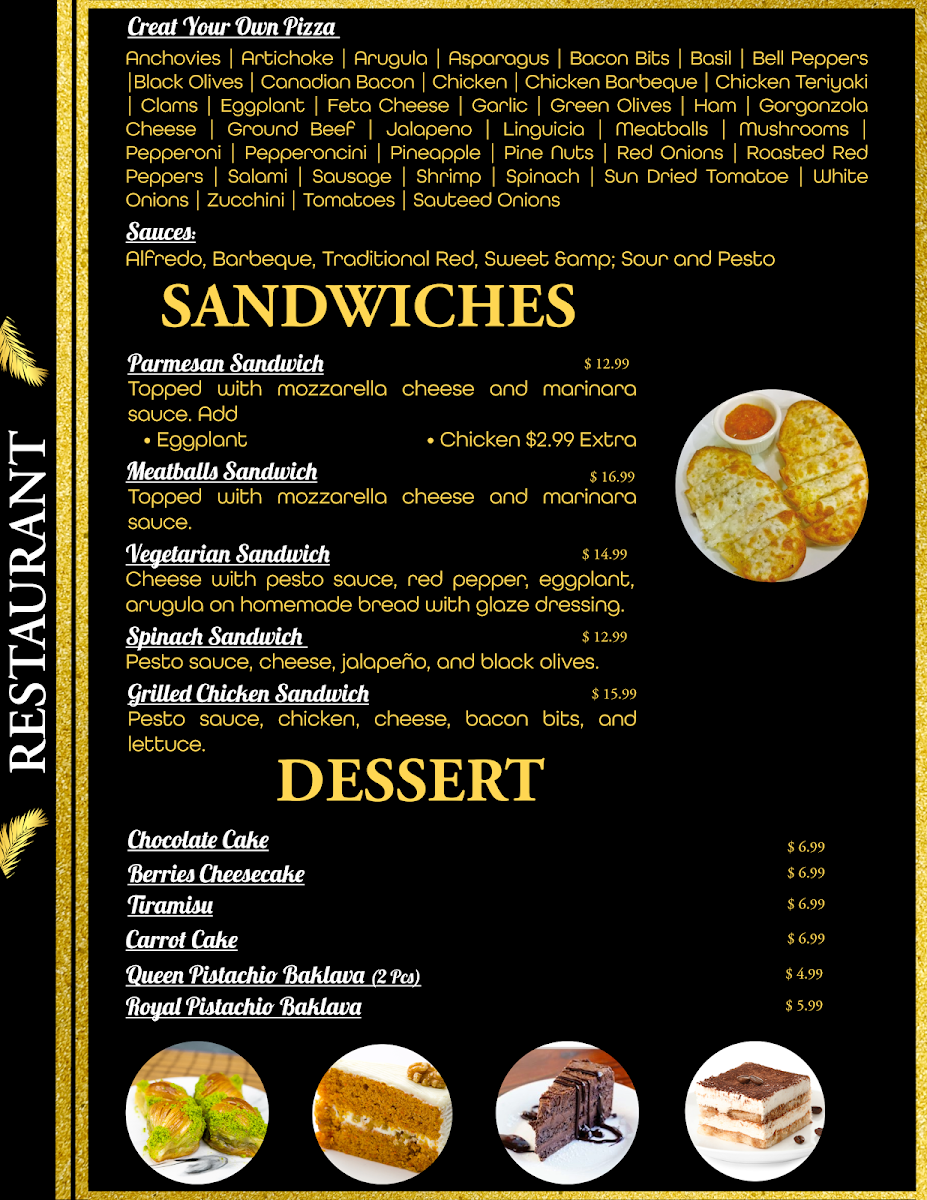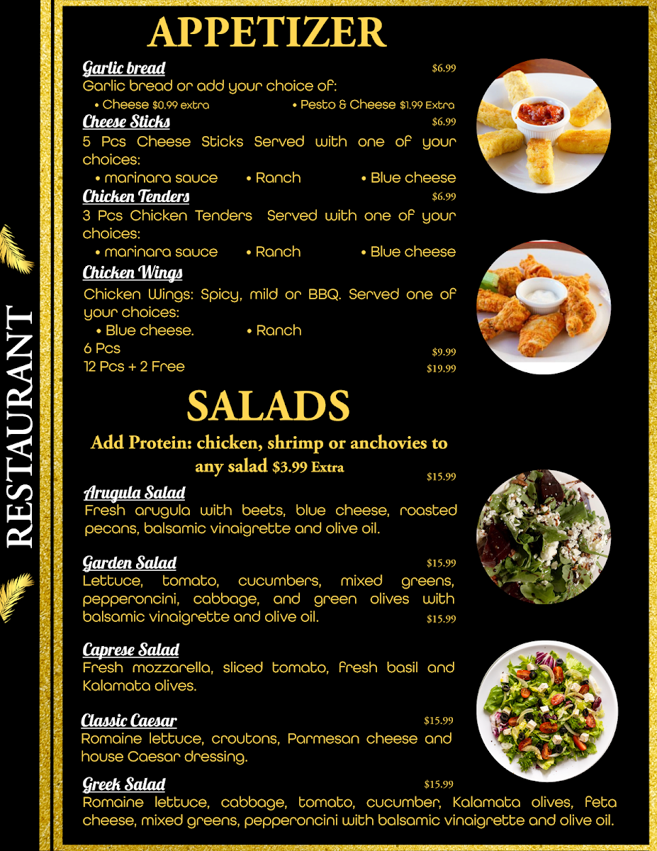 Guests can expect a variety of pizzas, ranging from simple cheese slices to more distinctive choices like the Spanish Pizza or the hefty Meat Lover's, which suit different appetites and group gatherings alike. Alongside these, there are fresh salads, such as the Caesar with anchovies or the vibrant Greek Salad, perfect for a lighter moment or to complement any pizza order.